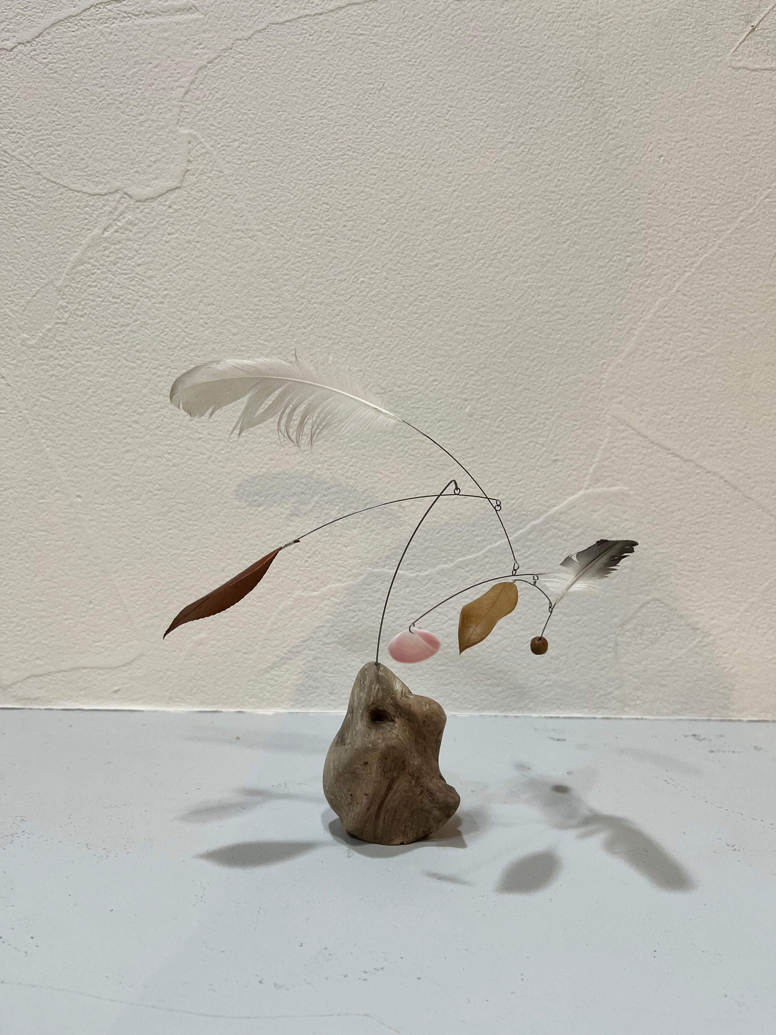 海で拾い集めた種子、羽、貝、流木などの漂流物を動く彫刻:モビール(mobile)を制作している。